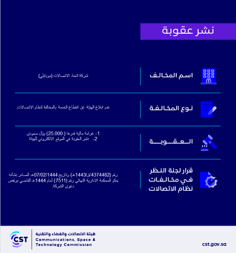 هيئة الاتصالات وتقنية المعلومات تنشر قرار لجنة النظر في مخالفات نظام الاتصالات رقم (4374482/ق/1443هـ) لمخالفة (شركة اتحاد الاتصالات (موبايلي) لنظام الاتصالات