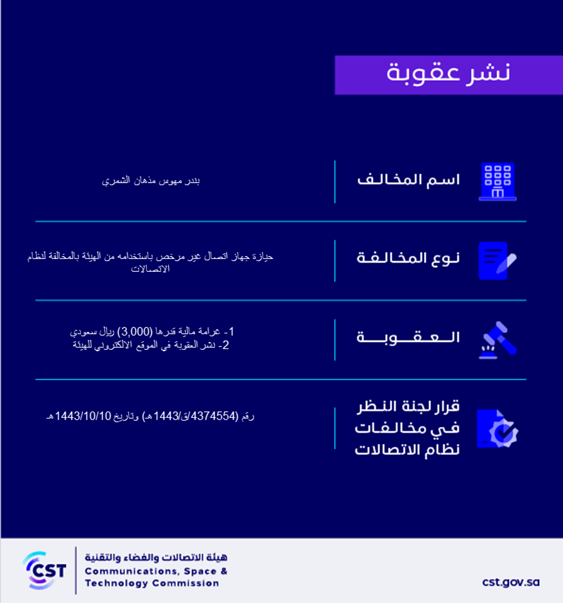 هيئة الاتصالات والفضاء والتقنية تنشر قرار لجنة النظر في مخالفات نظام الاتصالات رقم (4374554/ق/1443هـ) لمخالفة بندر مهوس مذهان الشمري لنظام الاتصالات
