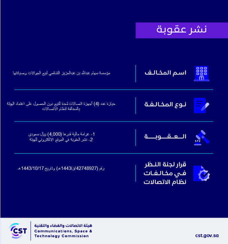 هيئة الاتصالات والفضاء والتقنية تنشر قرار لجنة النظر في مخالفات نظام الاتصالات رقم (42748927/ق/1443هـ) لمخالفة مؤسسة سهام عبدالله بن عبدالعزيز الشافعي لبيع الجوالات وصيانتها لنظام الاتصالات