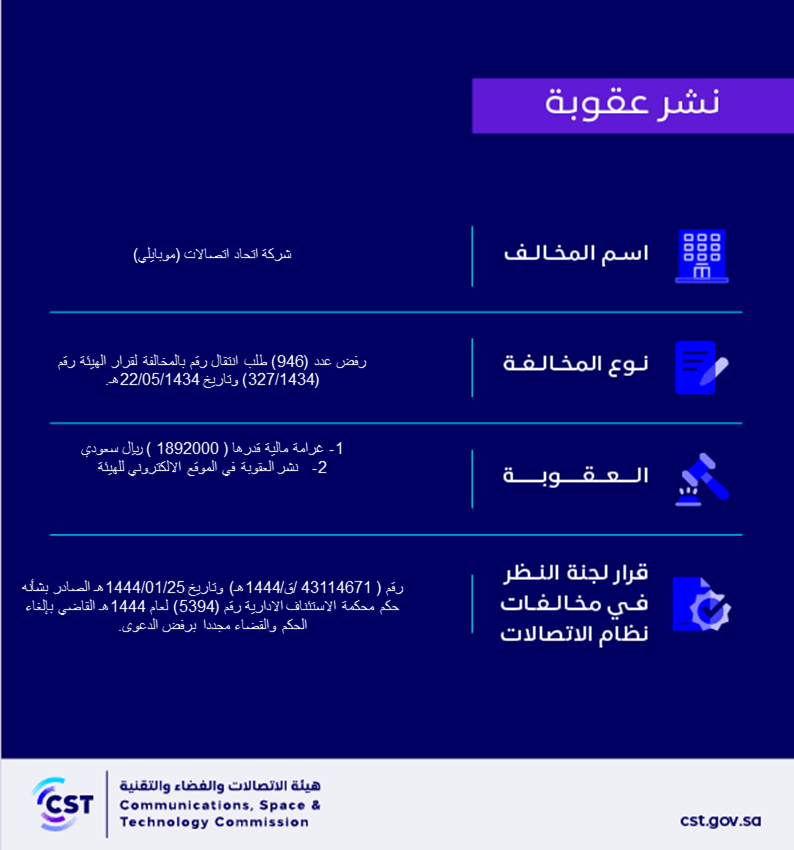 هيئة الاتصالات وتقنية المعلومات تنشر قرار لجنة النظر في مخالفات نظام الاتصالات رقم ( 43114671 /ق/1444هـ) لمخالفة شركة اتحاد اتصالات (موبايلي) لنظام الاتصالات