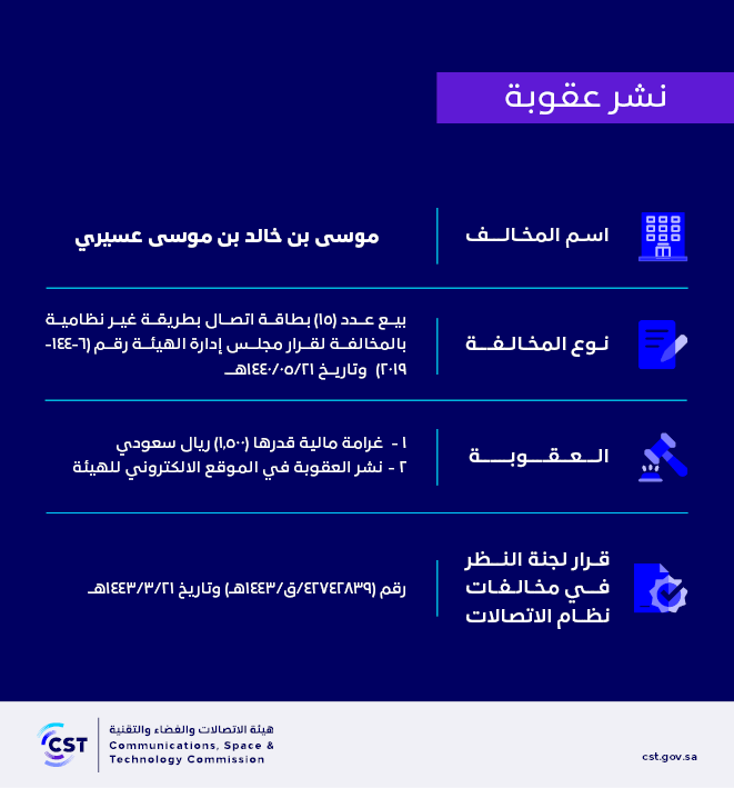 هيئة الاتصالات والفضاء والتقنية تنشر قرار لجنة النظر في مخالفات نظام الاتصالات رقم (42742839/ق/1443هـ) لمخالفة (موسى بن خالد بن موسى عسيري) لنظام الاتصالات