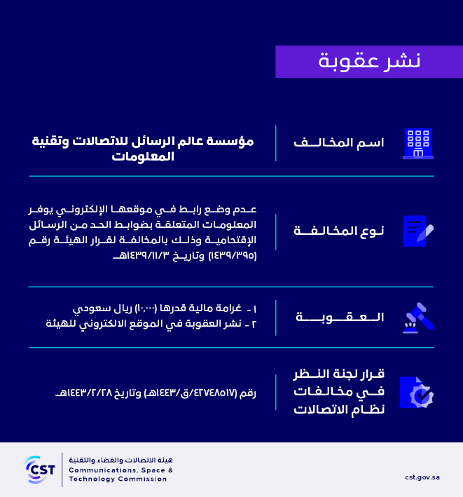 هيئة الاتصالات والفضاء والتقنية تنشر قرار لجنة النظر في مخالفات نظام الاتصالات رقم (42748517/ق/1443هـ) لمخالفة (مؤسسة عالم الرسائل للإتصالات وتقنية المعلومات) لنظام الاتصالات
