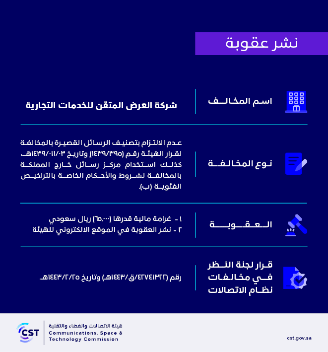 هيئة الاتصالات والفضاء والتقنية تنشر قرار لجنة النظر في مخالفات نظام الاتصالات رقم (42741322/ق/1443هـ) لمخالفة (شركة العرض المتقن للخدمات التجارية) لنظام الاتصالات