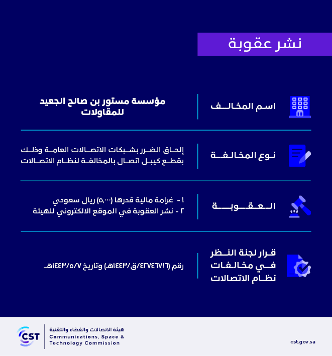 هيئة الاتصالات والفضاء والتقنية تنشر قرار لجنة النظر في مخالفات نظام الاتصالات رقم (42746716/ق/1443هـ) لمخالفة (مؤسسة مستور بن صالح الجعيد للمقاولات) لنظام الاتصالات