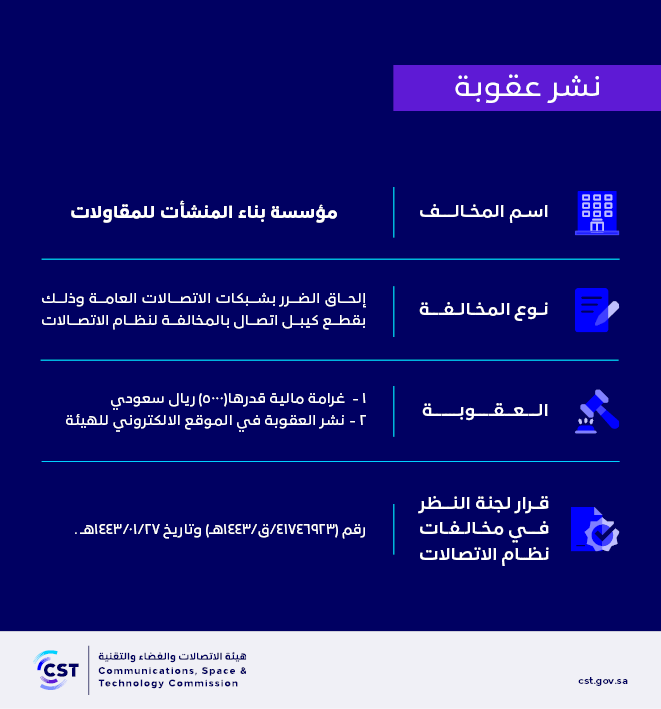 هيئة الاتصالات والفضاء والتقنية تنشر قرار لجنة النظر في مخالفات نظام الاتصالات رقم (41746923/ق/1443هـ) لمخالفة (مؤسسة بناء المنشأت للمقاولات) لنظام الاتصالات