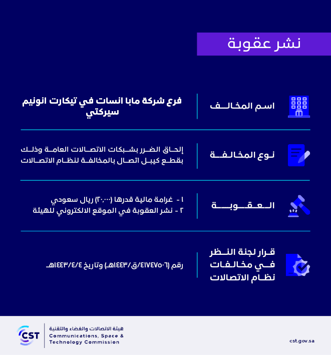 هيئة الاتصالات والفضاء والتقنية تنشر قرار لجنة النظر في مخالفات نظام الاتصالات رقم (41747506/ق/1443هـ) لمخالفة (فرع شركة مابا انسات في تيكارت انونيم سيركتي) لنظام الاتصالات