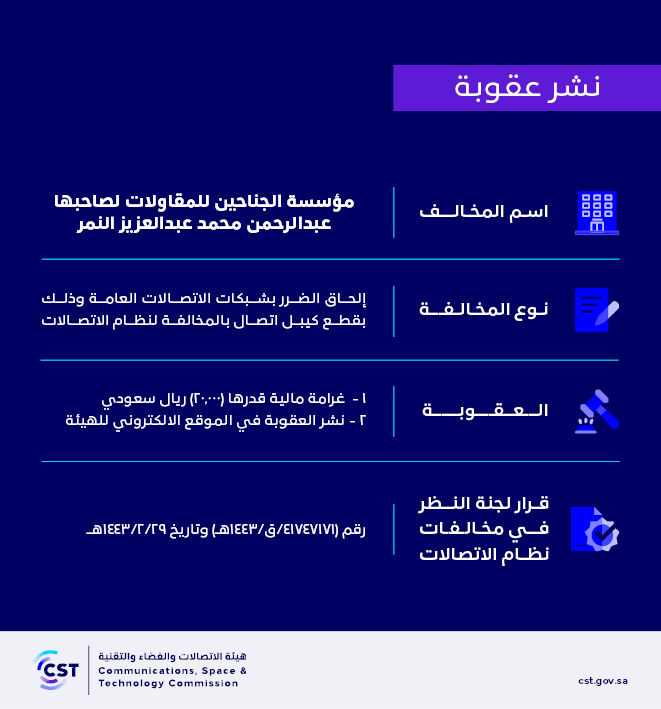 هيئة الاتصالات والفضاء والتقنية تنشر قرار لجنة النظر في مخالفات نظام الاتصالات رقم (41747171/ق/1443هـ) لمخالفة (مؤسسة الجناحين للمقاولات لصاجبها /عبدالرحمن محمد عبدالعزيز النمر) لنظام الاتصالات