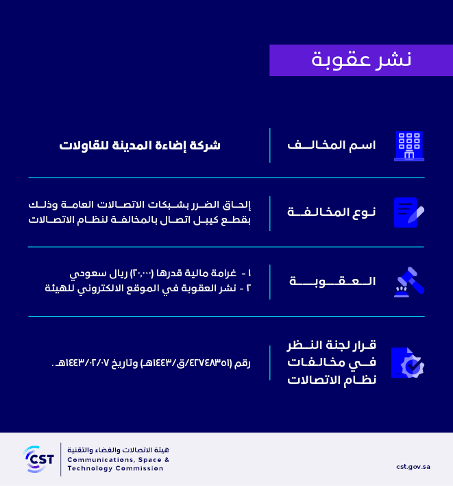 هيئة الاتصالات والفضاء والتقنية تنشر قرار لجنة النظر في مخالفات نظام الاتصالات رقم (42748351/ق/1443هـ) لمخالفة (شركة إضاءة المدينة للقاولات) لنظام الاتصالات