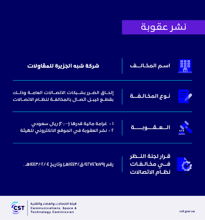 هيئة الاتصالات والفضاء والتقنية تنشر قرار لجنة النظر في مخالفات نظام الاتصالات رقم (42746579/ق/1443هـ) لمخالفة (شبه الجزيرة للمقاولات) لنظام الاتصالات
