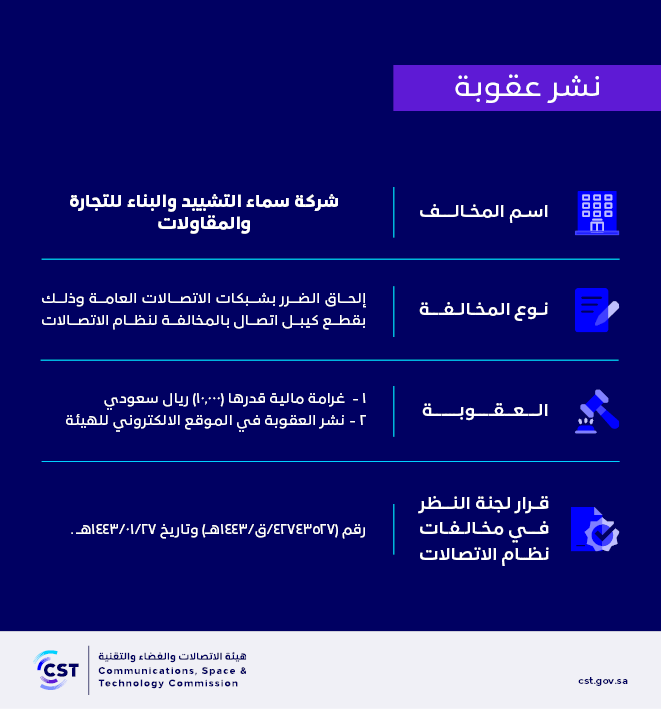 هيئة الاتصالات والفضاء والتقنية تنشر قرار لجنة النظر في مخالفات نظام الاتصالات رقم (42743527/ق/1443هـ) لمخالفة (شركة سماء التشييد والبناء للتجارة والمقاولات) لنظام الاتصالات