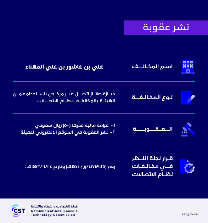 هيئة الاتصالات والفضاء والتقنية تنشر قرار لجنة النظر في مخالفات نظام الاتصالات رقم (41749124 /ق/1443هـ) لمخالفة (علي بن عاشور بن علي المهناء) لنظام الاتصالات