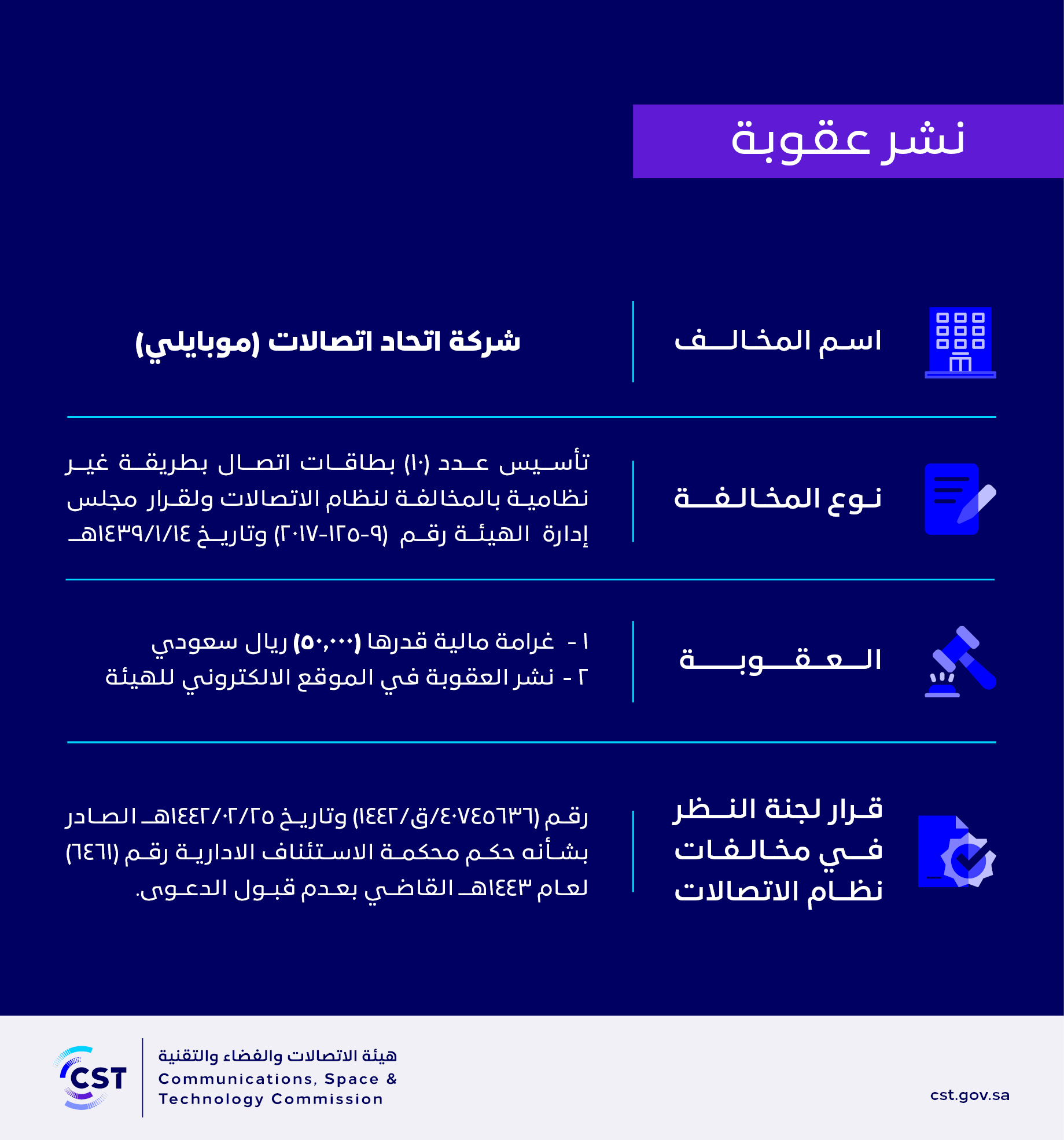 هيئة الاتصالات وتقنية المعلومات تنشر قرار لجنة النظر في مخالفات نظام الاتصالات رقم (40745636/ق/1443هـ) لمخالفة (شركة اتحاد اتصالات - موبايلي) لنظام الاتصالات