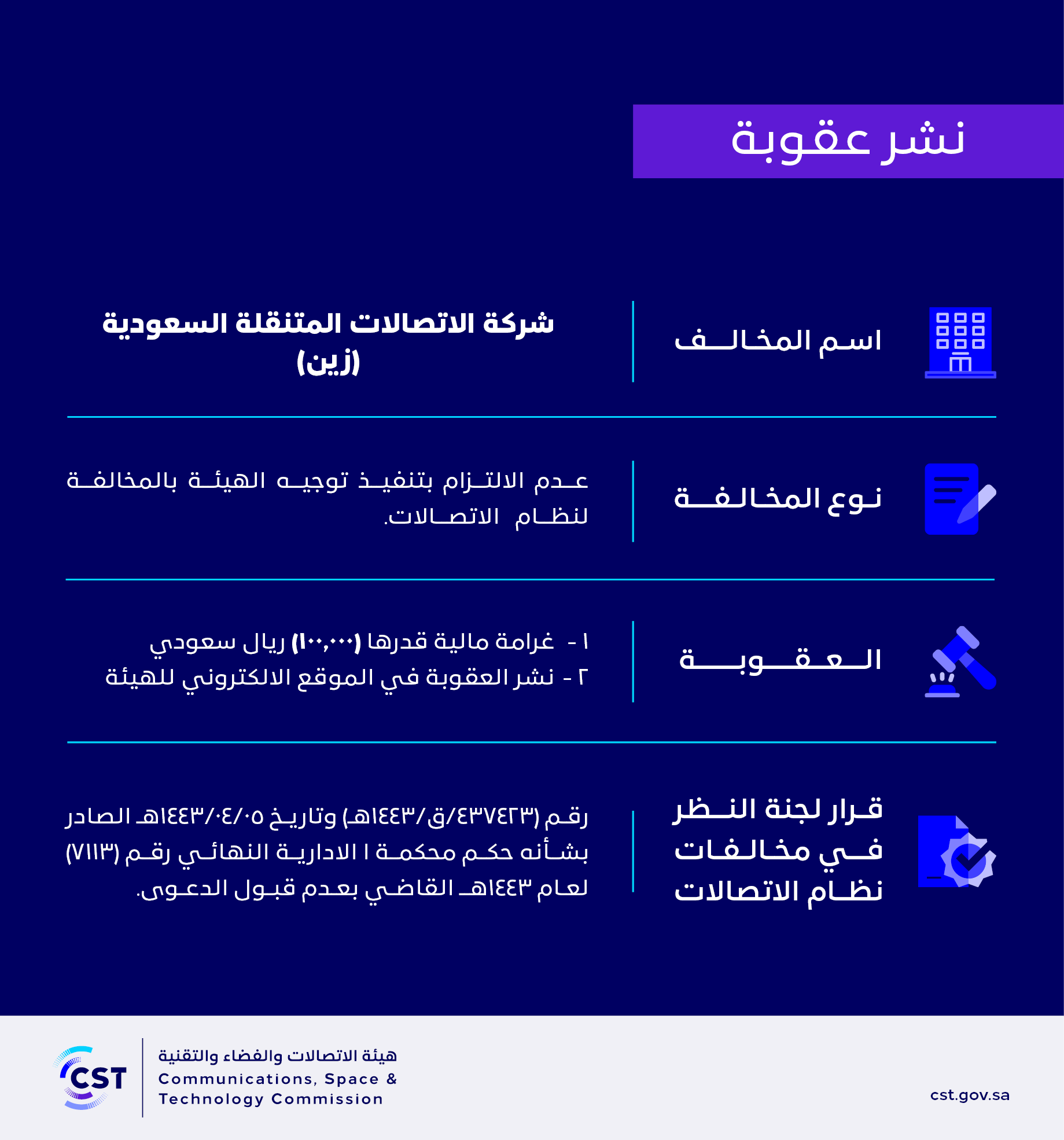 هيئة الاتصالات وتقنية المعلومات تنشر قرار لجنة النظر في مخالفات نظام الاتصالات رقم (437423/ق/1443هـ) لمخالفة (شركة الاتصالات المتنقلة السعودية - زين) لنظام الاتصالات