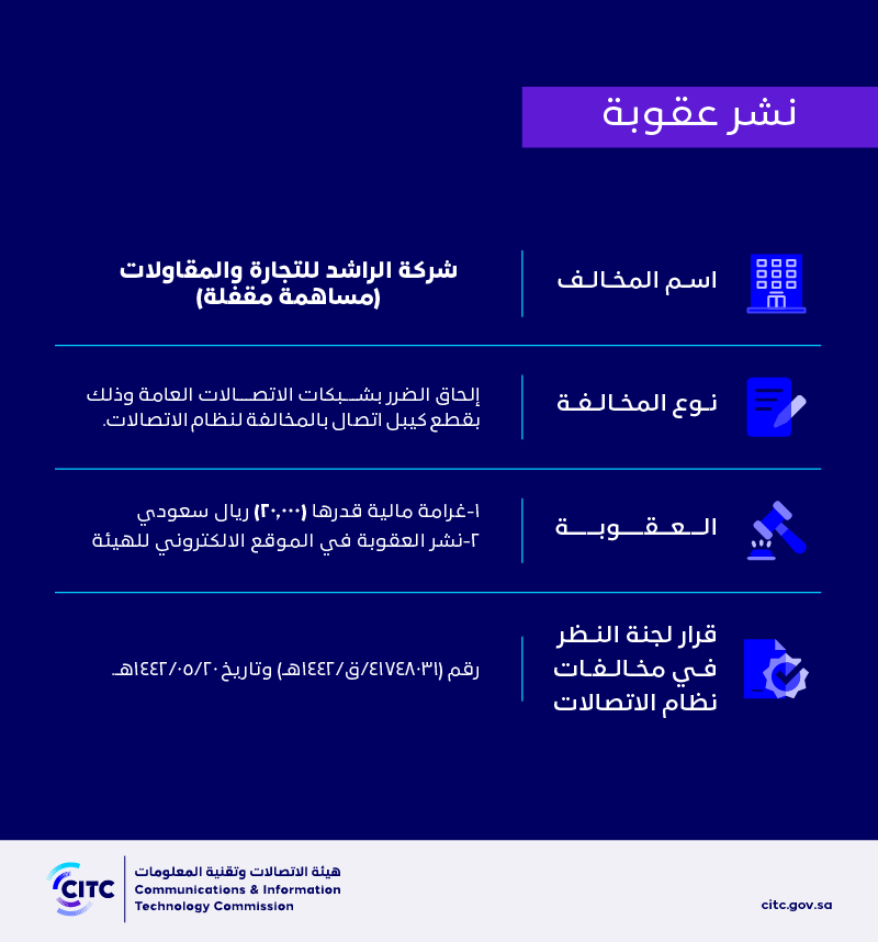 هيئة الاتصالات وتقنية المعلومات تنشر قرار لجنة النظر في مخالفات نظام الاتصالات رقم (41748031/ق/1442هـ) لمخالفة (شركة الراشد للتجارة والمقاولات) لنظام الاتصالات