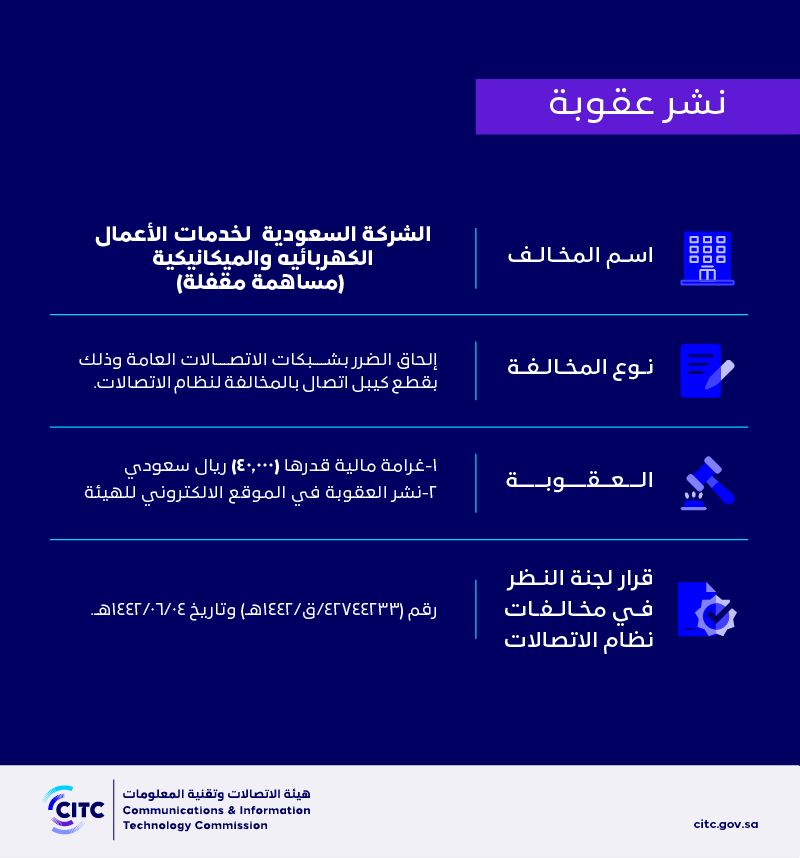 هيئة الاتصالات وتقنية المعلومات تنشر قرار لجنة النظر في مخالفات نظام الاتصالات رقم (42744233/ق/1442هـ) لمخالفة (الشركة السعودية لخدمات الأعمال الكهربائية والميكانيكة) لنظام الاتصالات
