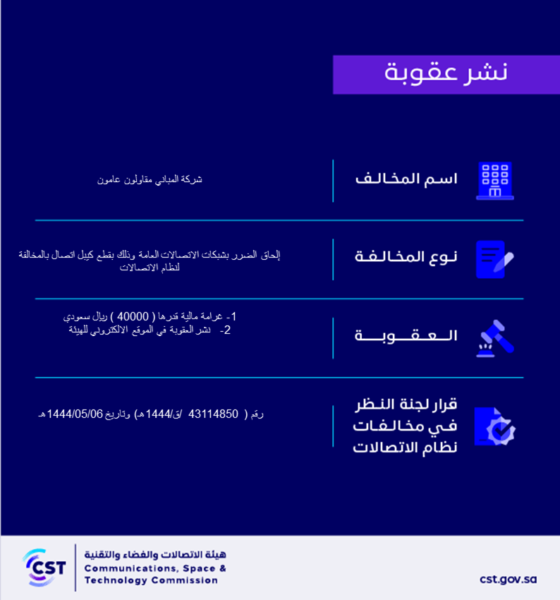 هيئة الاتصالات وتقنية المعلومات تنشر قرار لجنة النظر في مخالفات نظام الاتصالات رقم ( 43114850 /ق/1444هـ) لمخالفة ( شركة المباني مقاولون عامون ) لنظام الاتصالات