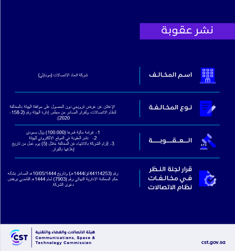هيئة الاتصالات وتقنية المعلومات تنشر قرار لجنة النظر في مخالفات نظام الاتصالات رقم (44114253/ق/1444هـ) لمخالفة (شركة اتحاد الاتصالات (موبايلي) لنظام الاتصالات
