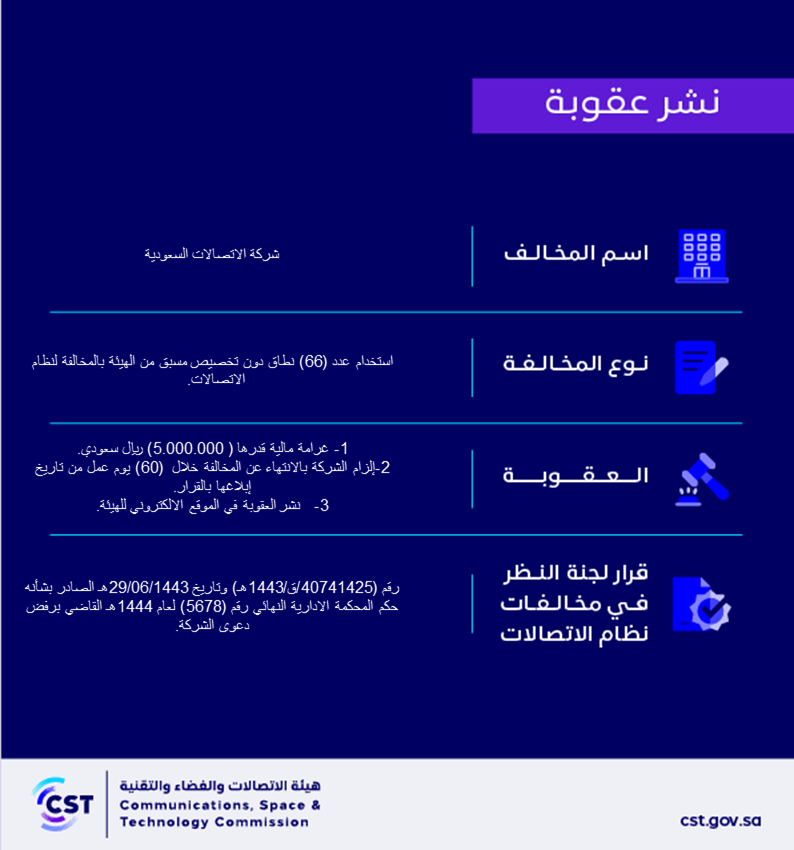 هيئة الاتصالات وتقنية المعلومات تنشر قرار لجنة النظر في مخالفات نظام الاتصالات رقم (40741425/ق/1443هــ) لمخالفة (شركة الاتصالات السعودية) لنظام الاتصالات