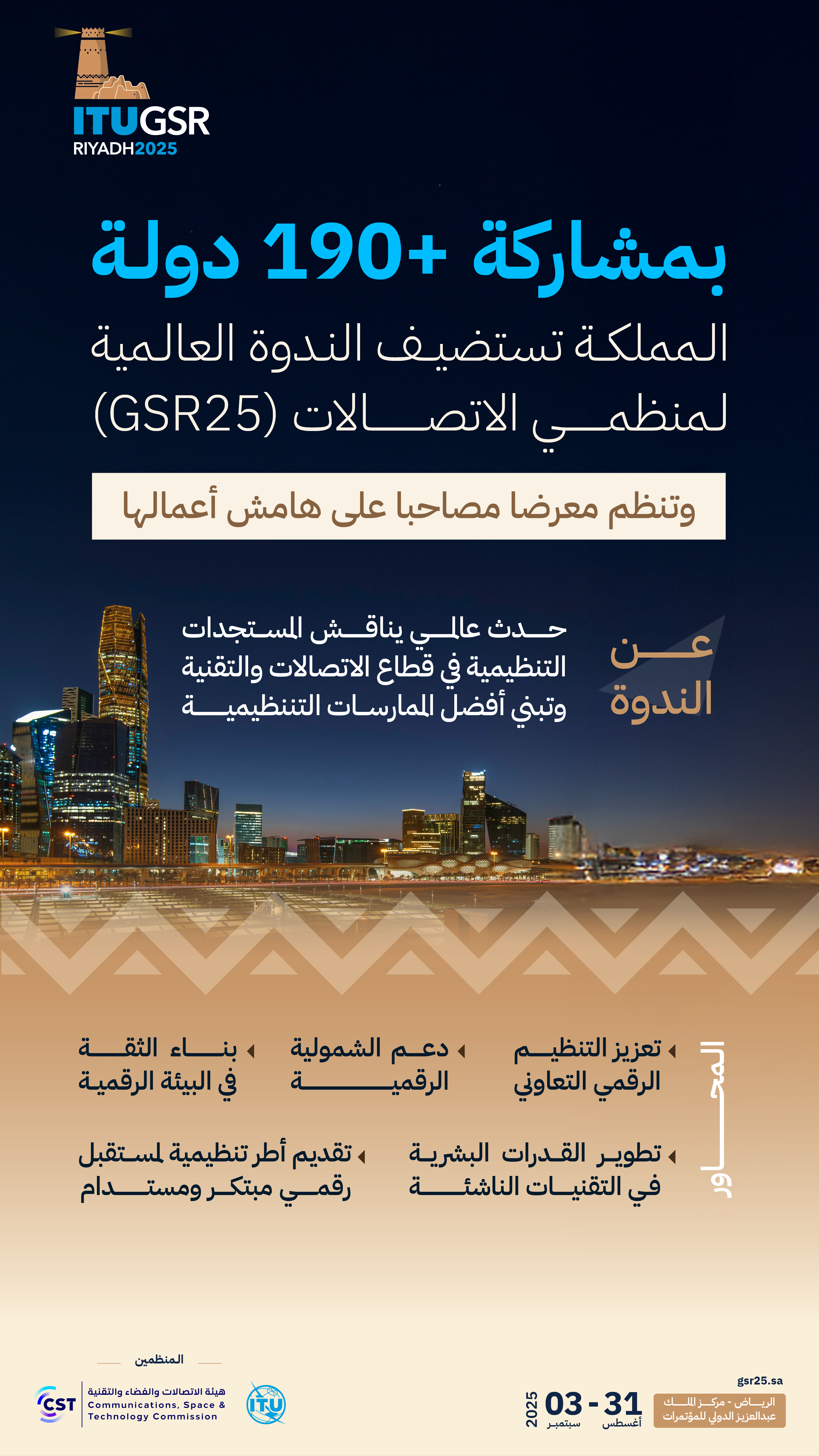 20250519510تستضيف المملكة ممثلة بهيئة الاتصالات والفضاء والتقنية، أعمال "الندوة العالمية لمنظمي الاتصالات (GSR25)" بمشاركة أكثر من 190 دولة، وبالشراكة مع الاتحاد الدولي للاتصالات، تحت شعار "التنظيم من أجل التنمية الرقمية المستدامة"، وذلك في مركز الملك عبدالعزيز الدولي للمؤتمرات بمدينة الرياض، حيث تنطلق أعمالها من 31 أغسطس حتى 3 سبتمبر 2025.