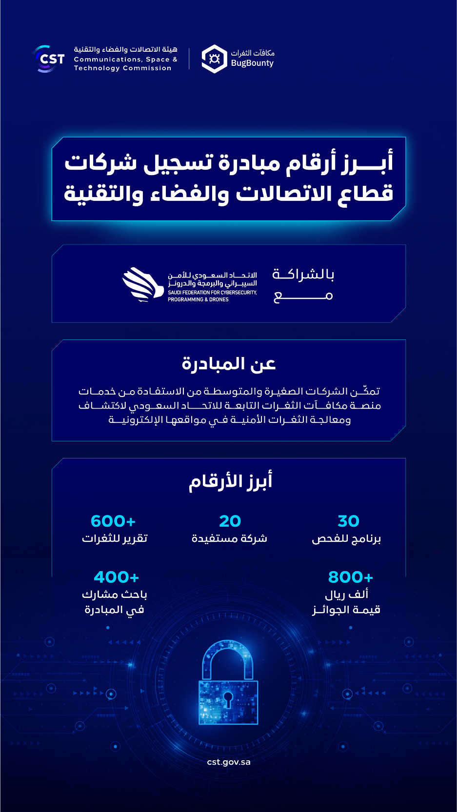 وتسعى المبادرة منذ إطلاقها إلى دعم الشركات الصغيرة والمتوسطة من خلال توفير باقات مجانية مخصصة، بجانب تحفيز الشركات الكبرى على الانضمام لها، حيث تجاوزت قيمة الجوائز في المبادرة الـ 800 ألف ريال، وإدراج أكثر من 30 برنامجا للفحص، وتسجيل ما يزيد عن 400 باحث في المنصة، واستلام أكثر من 600 تقريرا للثغرات المكتشفة.