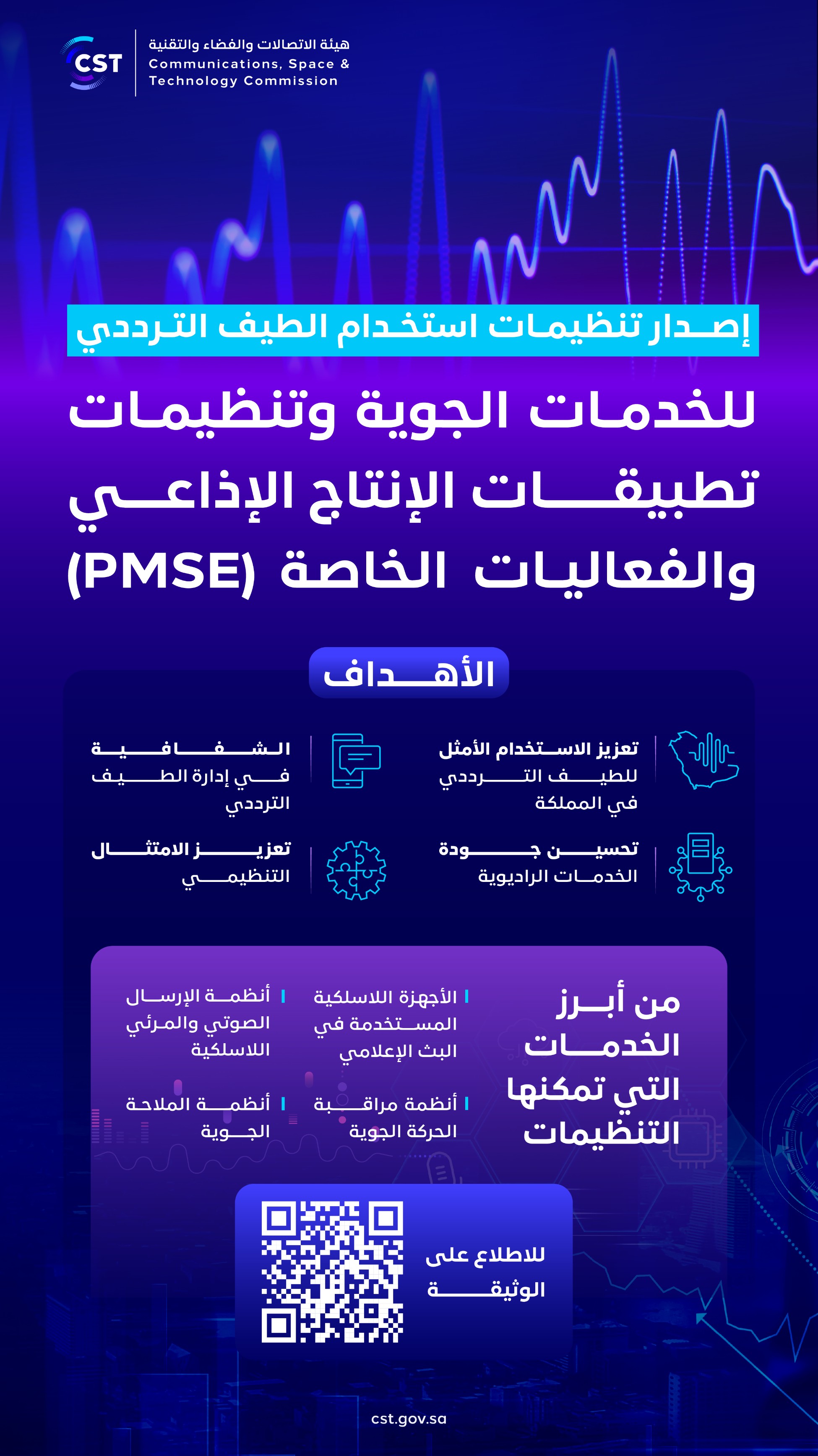 وأضافت أن "تنظيمات استخدام الطيف الترددي لتطبيقات الإنتاج الإذاعي والفعاليات الخاصة (PMSE)" تنظم استخدام الطيف الترددي بالتنسيق مع الجهات ذات العلاقة لتشغيل الميكروفونات اللاسلكية، وأنظمة الإرسال الصوتي والمرئي اللاسلكية، وأنظمة التحكم عن بعد، والكاميرات اللاسلكية، والأجهزة اللاسلكية المستخدمة في البث الإعلامي، والتغطيات التلفزيونية، والعروض الحية، والمناسبات الثقافية والدينية، والفعاليات الرياضية والترفيهية، إضافة إلى الاستخدامات في استوديوهات الإذاعة والتلفزيون، والمؤسسات التعليمية، وقاعات الاجتماعات، والمسارح، وغيرها من الأجهزة المستخدمة في الإنتاج الإذاعي والفعاليات الخاصة (PMSE).