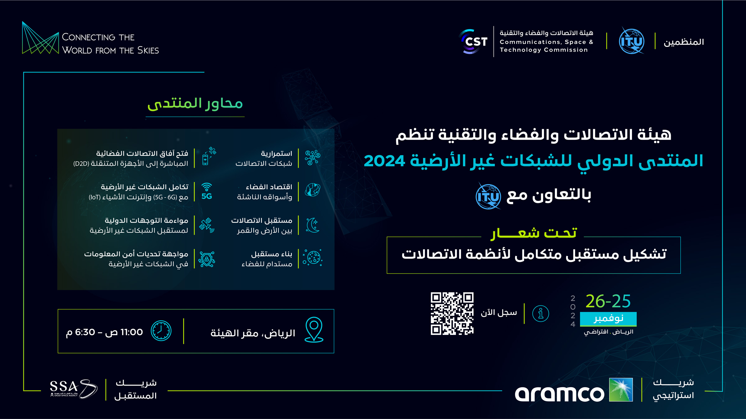 وأوضحت الهيئة أن المنتدى سيتناول مواضيع تناقش: استمرارية شبكات الاتصالات، واقتصاد الفضاء وأسواقه الناشئة، وفتح آفاق الاتصالات الفضائية المباشرة إلى الأجهزة المتنقلة (D2D)، بالإضافة إلى تكامل الشبكات غير الأرضية مع الجيل الخامس (5G) والجيل السادس (6G) وإنترنت الأشياء (IoT)، ومواءمة التوجهات الدولية لمستقبل الشبكات غير الأرضية، ومستقبل الاتصالات بين الأرض والقمر، إلى جانب مواجهة تحديات أمن المعلومات في الشبكات غير الأرضية، وبناء مستقبل مستدام للفضاء، وذلك خلال جلسات حوارية وعروض تقديمية بمشاركة نخبة من القادة، الخبراء، الباحثين، صناع السياسات، المستثمرين، والجهات التنظيمية في مجالات الاتصالات والفضاء والتقنية والطيف الترددي، من مختلف دول العالم.