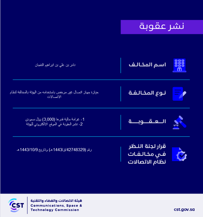 The Communications, Space and Technology Commission publishes the decision of the Committee for Review of Communications System Violations No. (42748329/Q/1443 AH) regarding Nader bin Ali bin Ibrahim Al-Nafjan’s violation of the communications system
