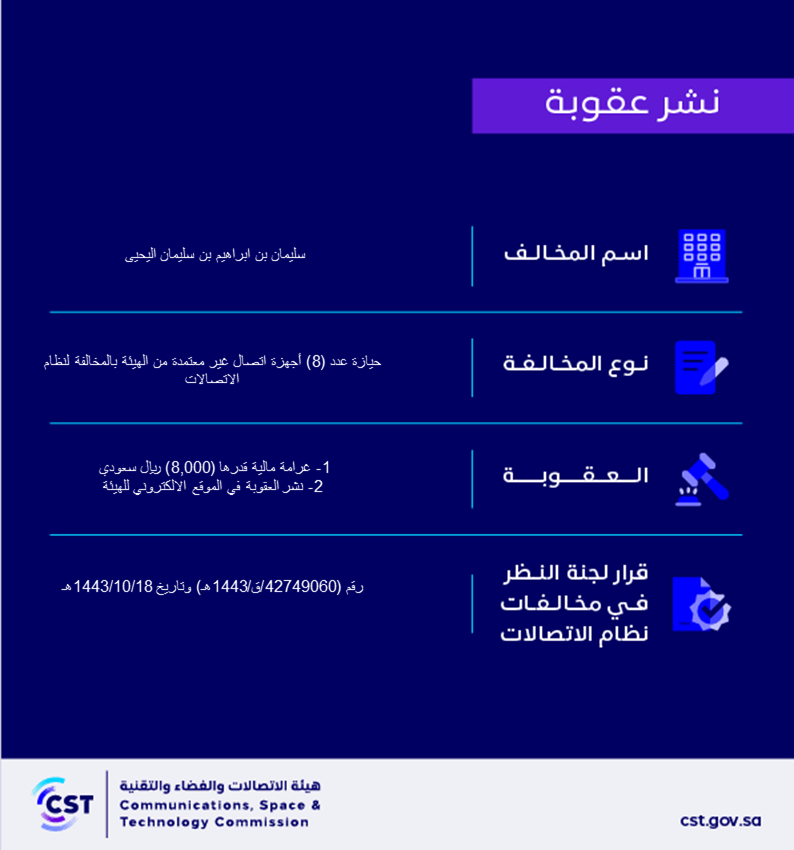 The Communications, Space and Technology Commission publishes the decision of the Committee for Review of Communications System Violations No. (42749060/Q/1443 AH) regarding Suleiman bin Ibrahim bin Suleiman Al-Yahya’s violation of the communications system.
