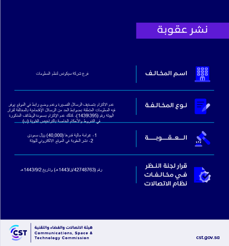 The Communications, Space and Technology Commission publishes the decision of the Committee for Review of Communications System Violations No. (42748763/Q/1443 AH) regarding the violation of the communications system by the Sequence Information Systems Company branch.