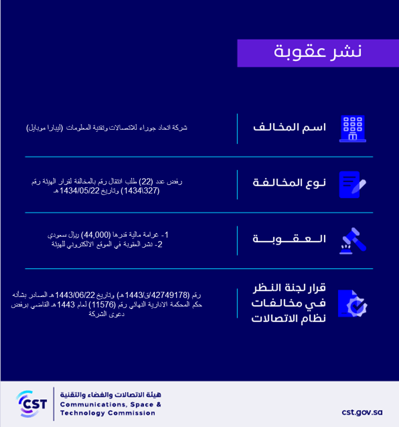 The Communications, Space and Technology Commission publishes the decision of the Committee for Review of Communications System Violations No. (42749178/Q/1443 AH) regarding the violation of the communications system by Jura Etihad Communications and Information Technology Company (Lebara Mobile).
