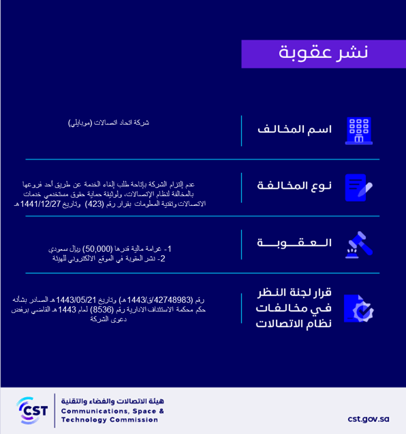The Communications, Space and Technology Commission publishes the decision of the Committee for Review of Communications System Violations No. (42748983/Q/1443 AH) regarding Etihad Etisalat Company (Mobily)’s violation of the communications system.