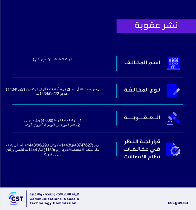 The Communications, Space and Technology Commission publishes the decision of the Committee for Review of Communications System Violations No. (40747627/Q/1443 AH) regarding Etihad Etisalat Company (Mobily)’s violation of the communications system.