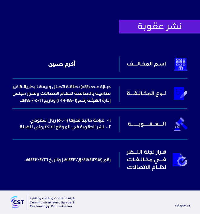 The Communications, Space and Technology Commission publishes the decision of the Committee for Review of Communications System Violations No. (417412918/Q/1443 AH) regarding Akram Hussein’s violation of the communications system.