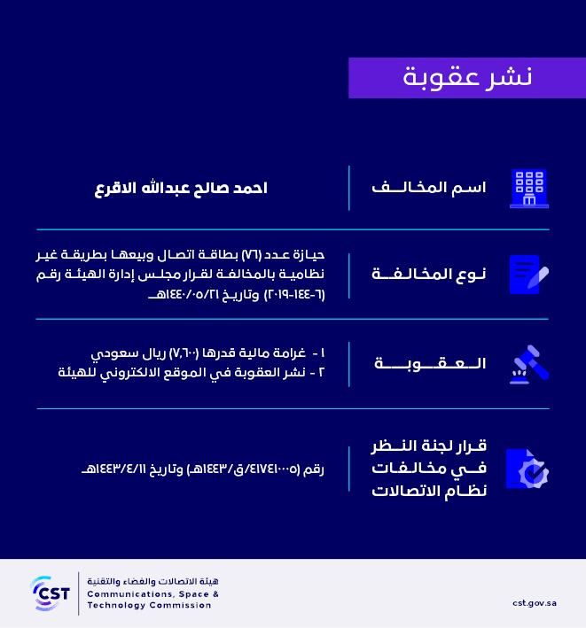 The Communications, Space and Technology Commission publishes the decision of the Committee for Review of Communications System Violations No. (417410005/Q/1443 AH) regarding (Ahmed Saleh Abdullah Al-Aqra’) violation of the communications system.