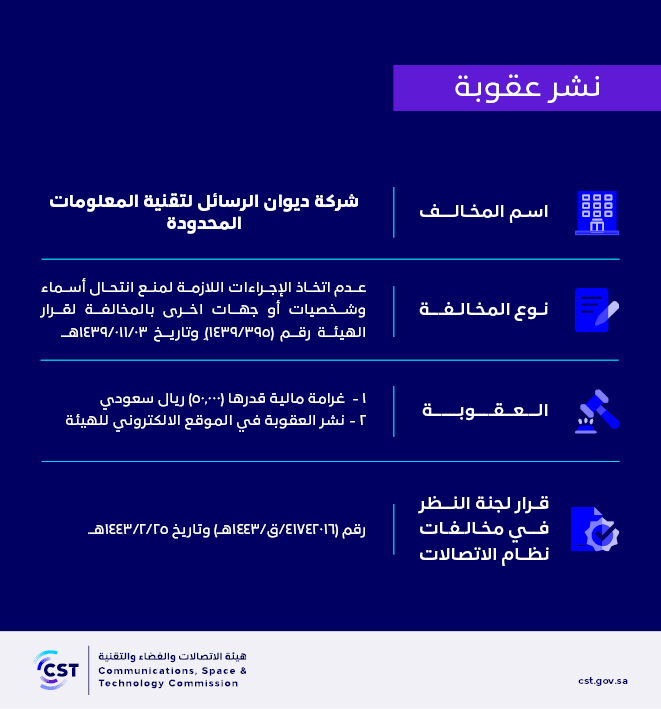 The Communications, Space and Technology Commission publishes the decision of the Committee for Review of Communications System Violations No. (41742016/Q/1443 AH) regarding (Diwan Al-Risala Information Technology Company Limited) violation of the communications system.