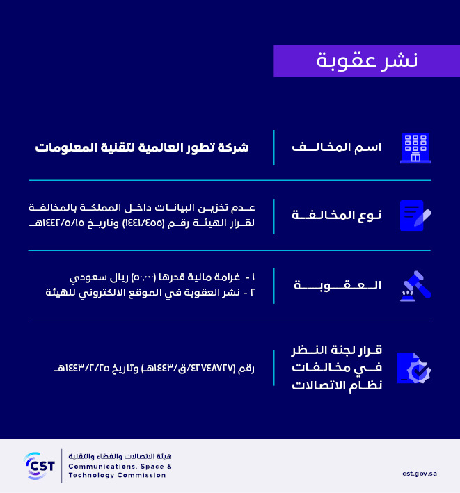 The Communications, Space and Technology Commission publishes the decision of the Committee for Reviewing Communications System Violations No. (42748727/Q/1443 AH) regarding (Tatwor International Information Technology Company)’s violation of the communications system.