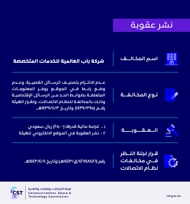 The Communications, Space and Technology Commission publishes the decision of the Committee for Reviewing Communications System Violations No. (42748486/Q/1443 AH) regarding (Bab International Specialized Services Company)’s violation of the communications system.