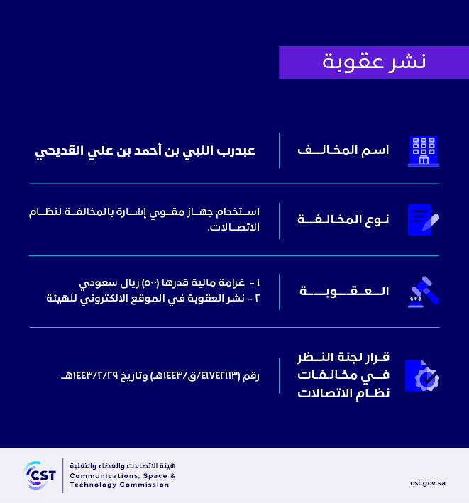 The Communications, Space and Technology Commission publishes the decision of the Committee for Review of Communications System Violations No. (41742113/Q/1443 AH) regarding (Abdul Rab al-Nabi bin Ahmed bin Ali al-Qudaihi) violating the communications system.