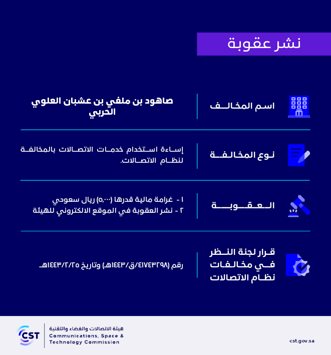 The Communications, Space and Technology Commission publishes the decision of the Committee for Review of Communications System Violations No. (41743298/Q/1443 AH) regarding (Sahoud bin Malfi bin Ashban Al-Alawi Al-Harbi) violating the communications system.