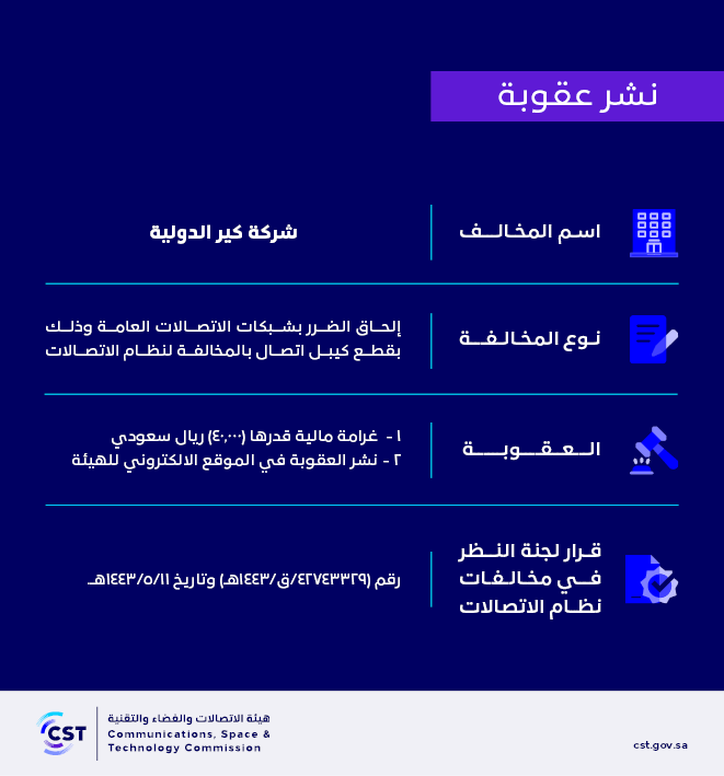 The Communications, Space and Technology Commission publishes the decision of the Committee for Review of Communications System Violations No. (42743329/Q/1443 AH) regarding (CARE International Company)’s violation of the communications system