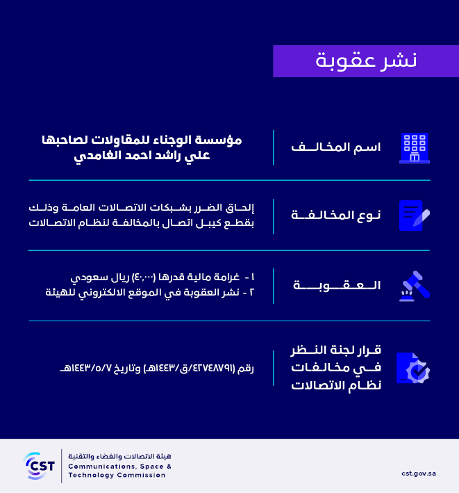 The Communications, Space and Technology Commission publishes the decision of the Committee for Review of Communications System Violations No. (42748791/Q/1443 AH) regarding (Al-Wajana Contracting Establishment)’s violation of the communications system