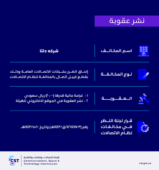 The Communications, Space and Technology Commission publishes the decision of the Committee for Reviewing Communications System Violations No. (42748703/Q/1443 AH) regarding Delta’s violation of the communications system.