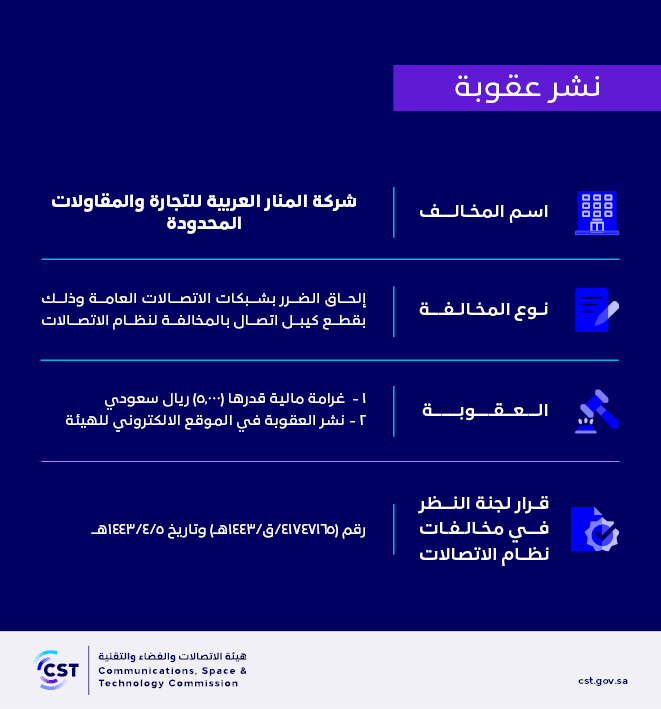 The Communications, Space and Technology Commission publishes the decision of the Committee for Review of Communications System Violations No. (41747165 /Q/1443 AH) regarding (Al-Manar Arabian Trading and Contracting Company)’s violation of the communications system.
