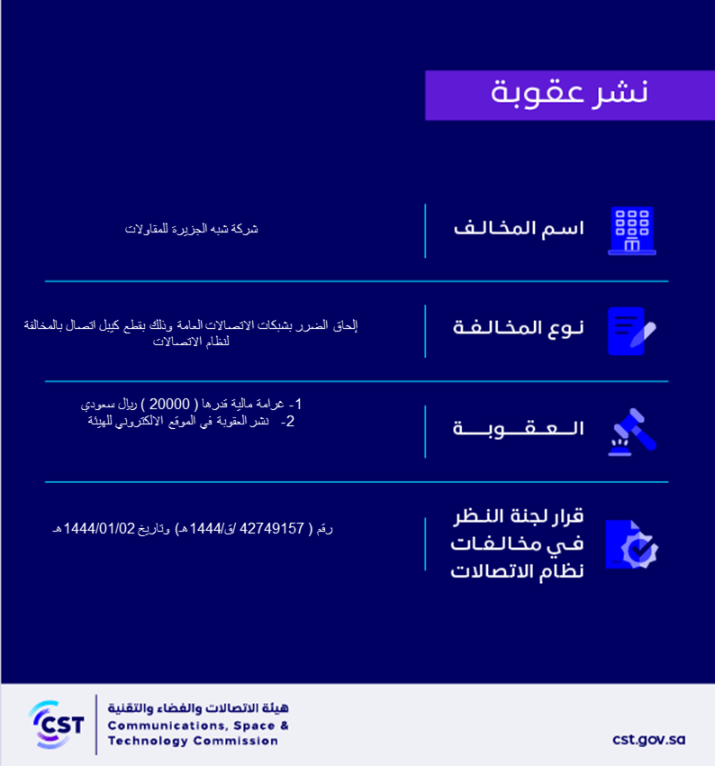 The Communications and Information Technology Commission publishes the decision of the Committee for Reviewing Violations of the Communications System No. (42749157 /Q/1444 AH) regarding (Peninsula Contracting Company)’s violation of the communications system