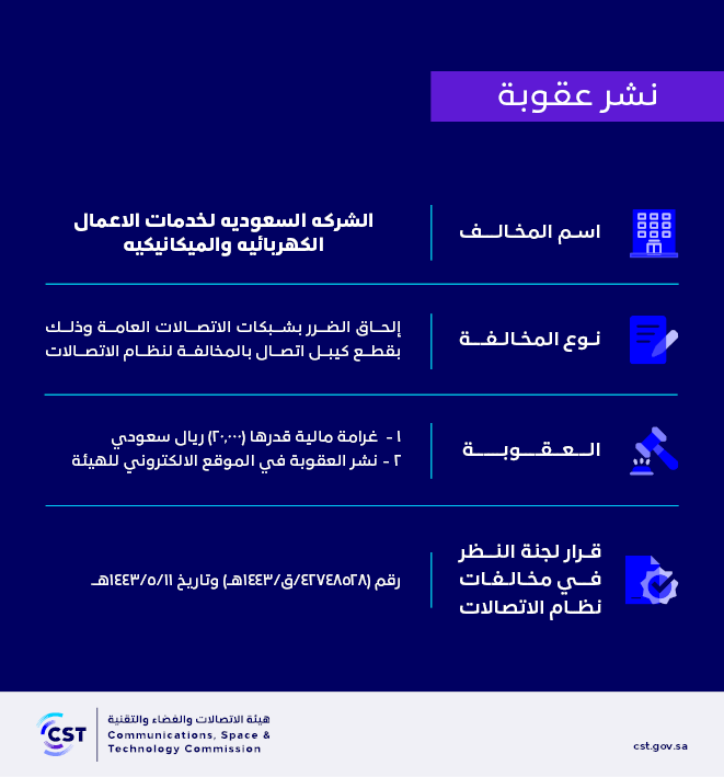 The Communications, Space and Technology Commission publishes the decision of the Committee for Review of Communications System Violations No. (42748528/Q/1443 AH) regarding (the Saudi Electrical and Mechanical Services Company)’s violation of the communications system.