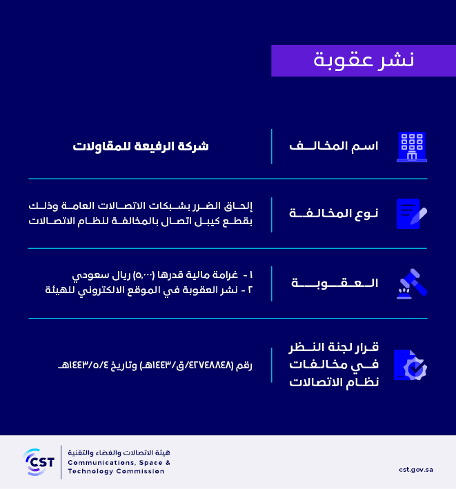 The Communications, Space and Technology Commission publishes the decision of the Committee for Review of Communications System Violations No. (42748848/Q/1443 AH) regarding (Al-Rafi’ah Contracting Company)’s violation of the communications system