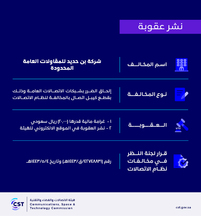 The Communications, Space and Technology Commission publishes the decision of the Committee for Reviewing Communications System Violations No. (42748831/Q/1443 AH) regarding (Bin Hadid General Contracting Company Limited)’s violation of the communications system.
