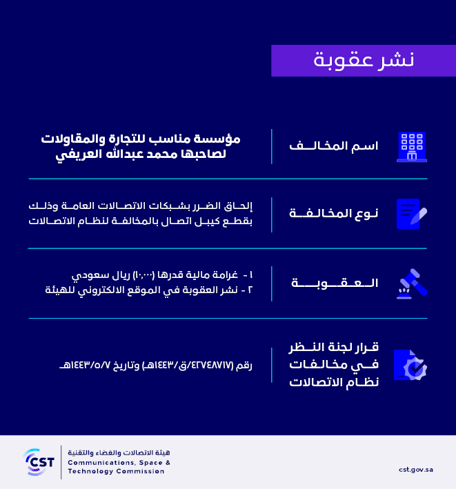 The Communications, Space and Technology Commission publishes the decision of the Committee to Consider Violations of the Communications System No. (42748717/Q/1443 AH) regarding (Maseeb Trading and Contracting Establishment)’s violation of the communications system.