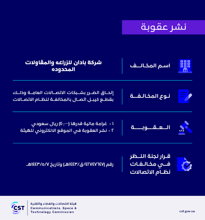 The Communications, Space and Technology Commission publishes the decision of the Committee for Review of Communications System Violations No. (42747647/Q/1443 AH) regarding (Baden Agriculture and Contracting Company Limited)’s violation of the communications system.