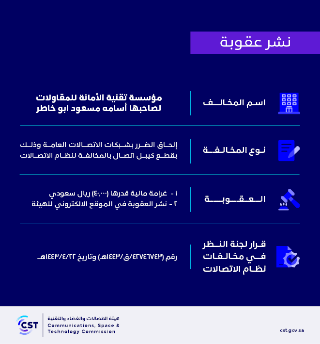 The Communications, Space and Technology Commission publishes the decision of the Committee for Review of Communications System Violations No. (42746743/Q/1443 AH) regarding (Al Amana Technology Contracting Establishment, owned by Osama Masoud Abu Khater) violating the communications system.